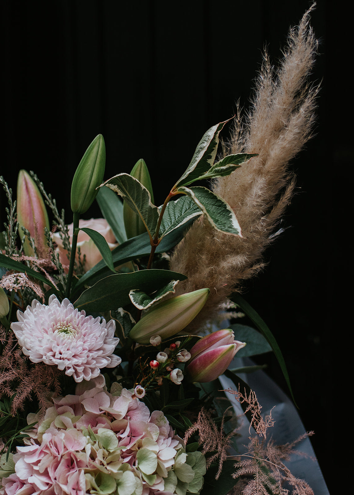 This stylish bouquet combines the wonderful texture off natural pampas grass, fresh green foliage with blushing leaves. A vintage effect that is in all around.