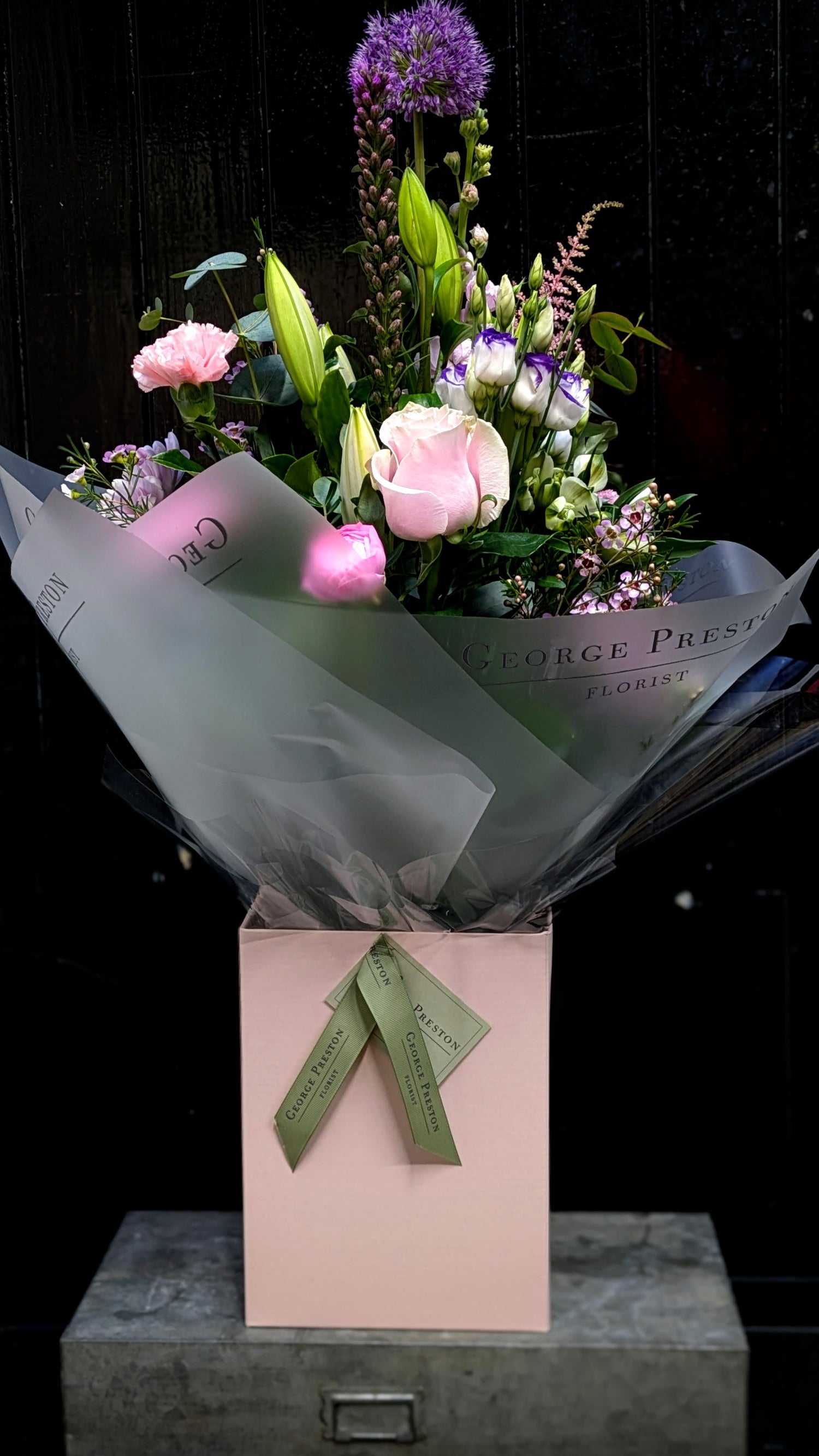 The bouquet is expertly hand tied and presented in a stunning pink presentation box with biodegradable wrapping.