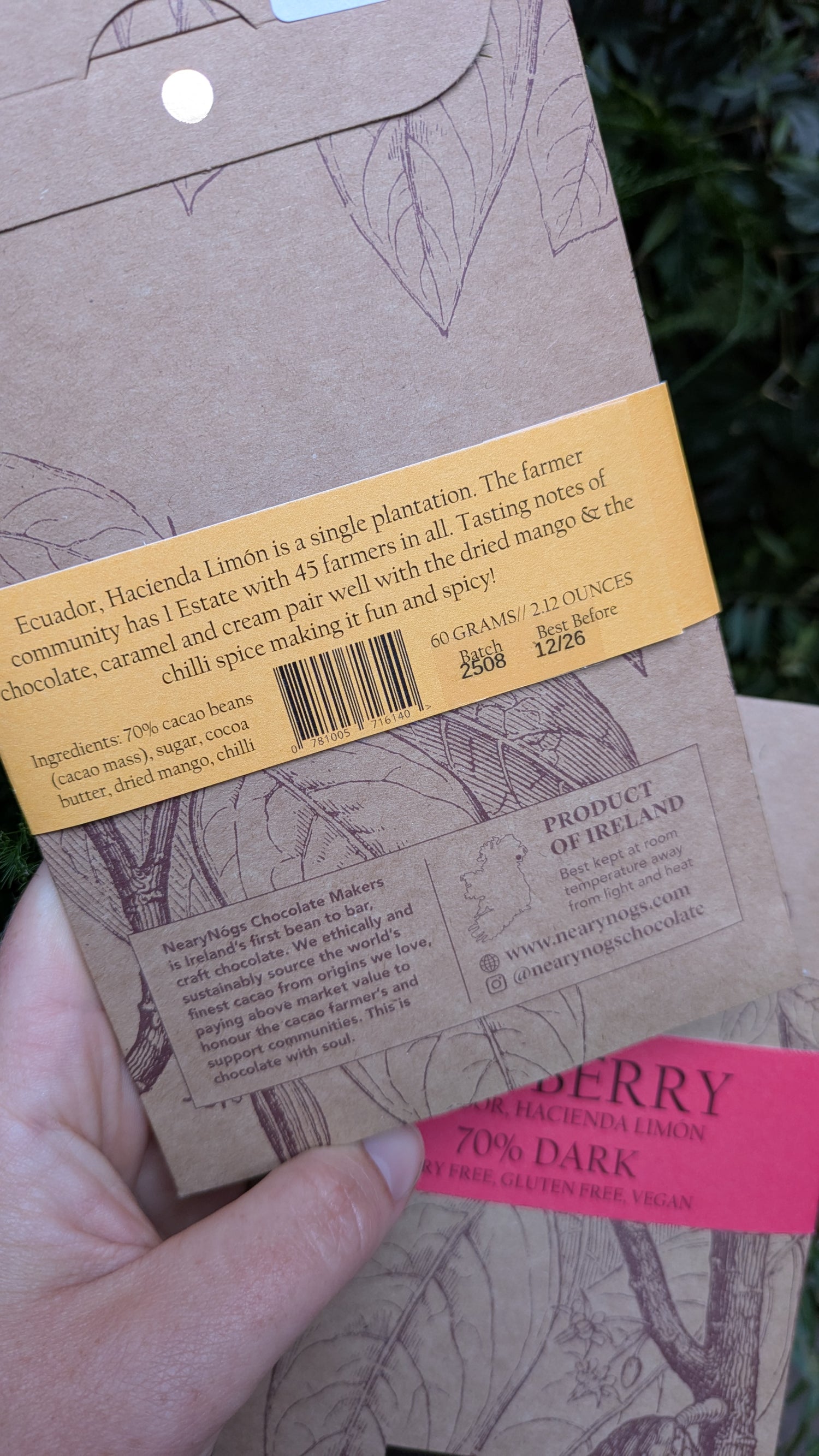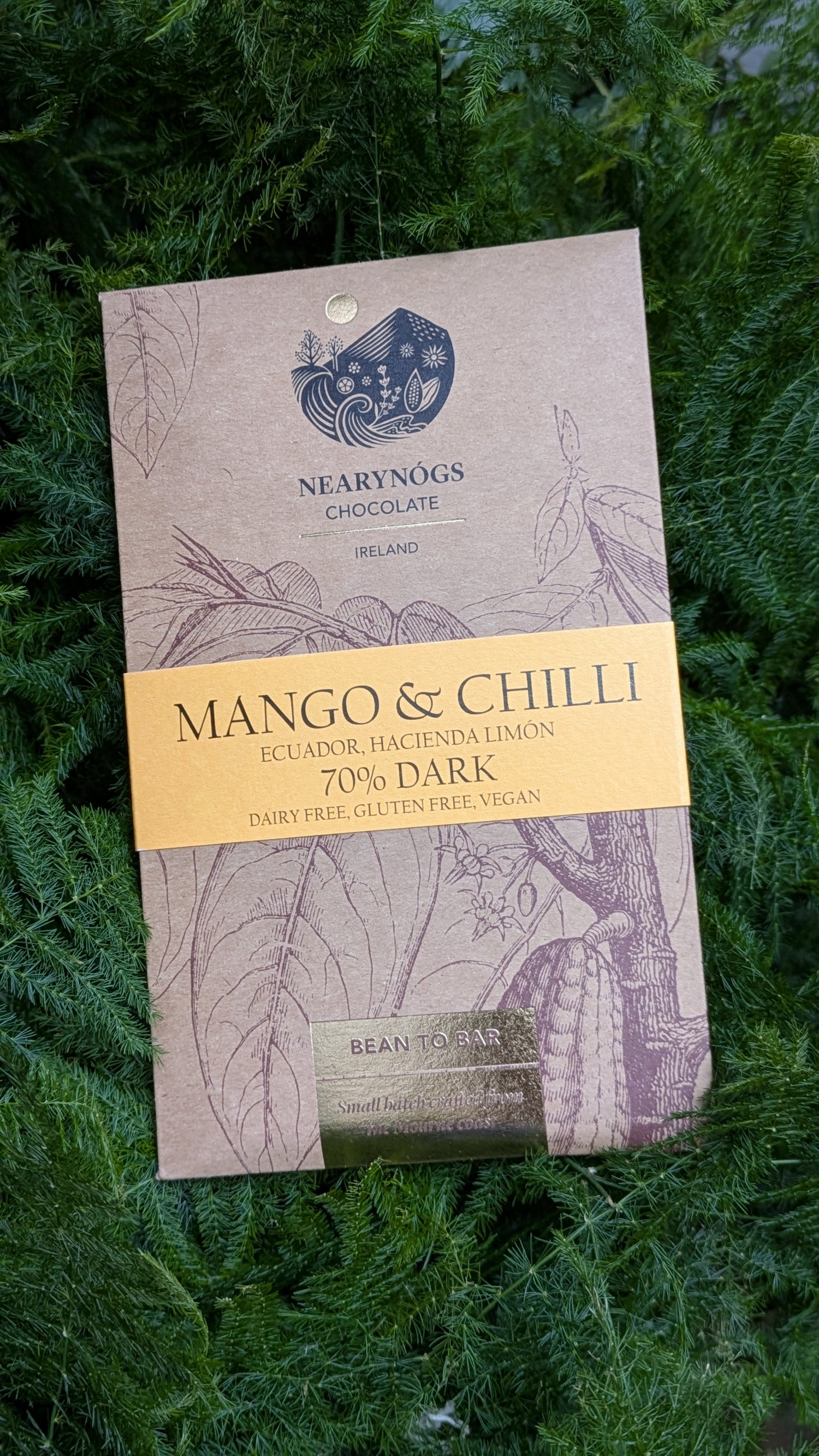 Ingredients: 72% Zorzal Dominican Chocolate, organic unrefined cane sugar, sun dried organic Mango, organic chilli.
