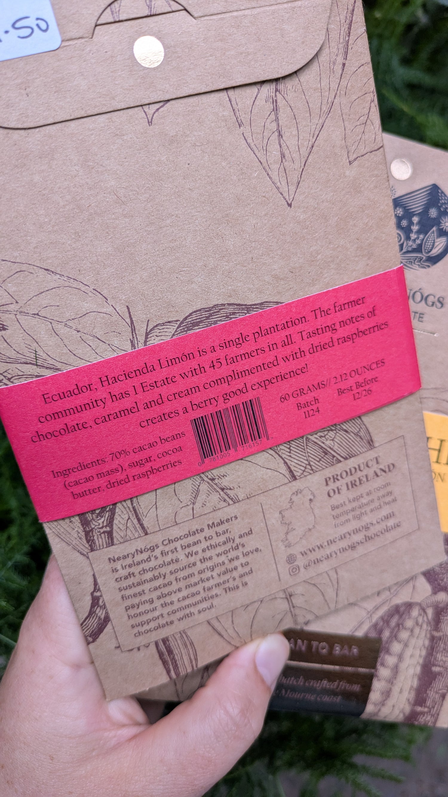 Ingredients: 72% Zorzal Dominican Chocolate, organic unrefined cane sugar, organic raspberry.