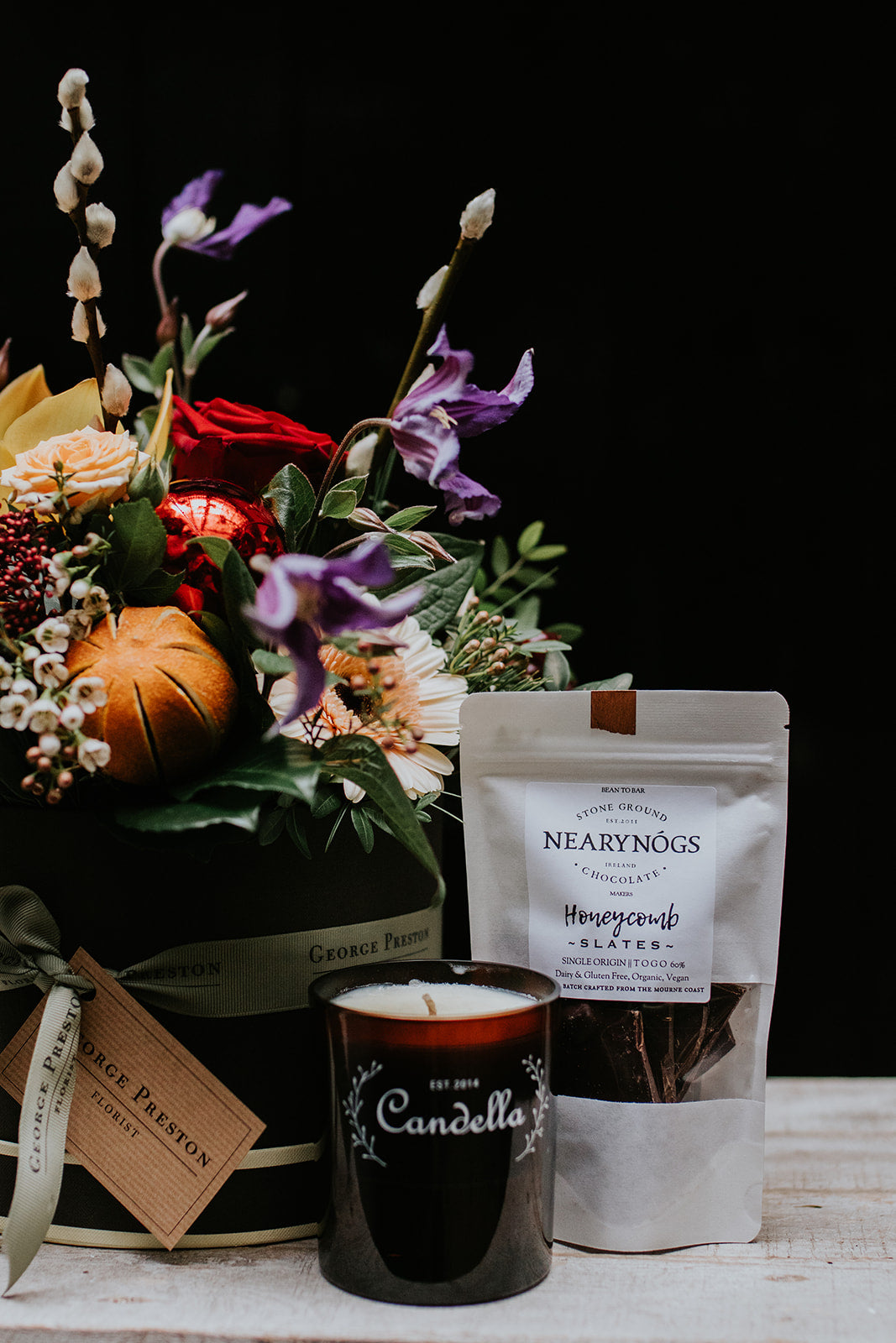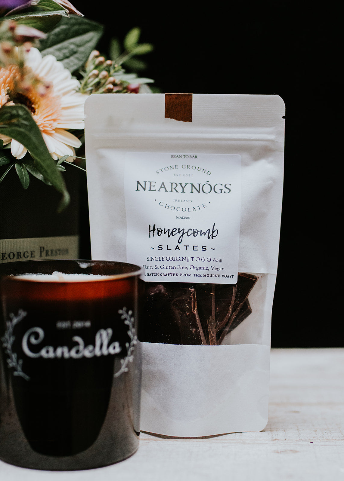 Accompanied with our locally made vegan Neary Nog Chocolate Slates and exclusive handmade soy wax Candella candle.