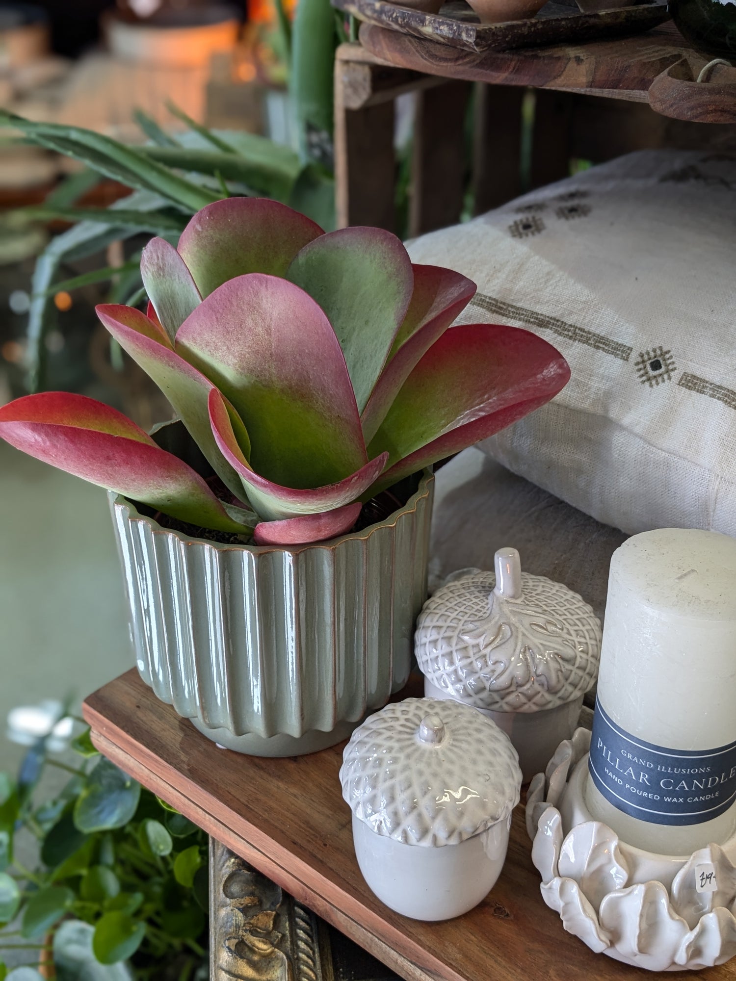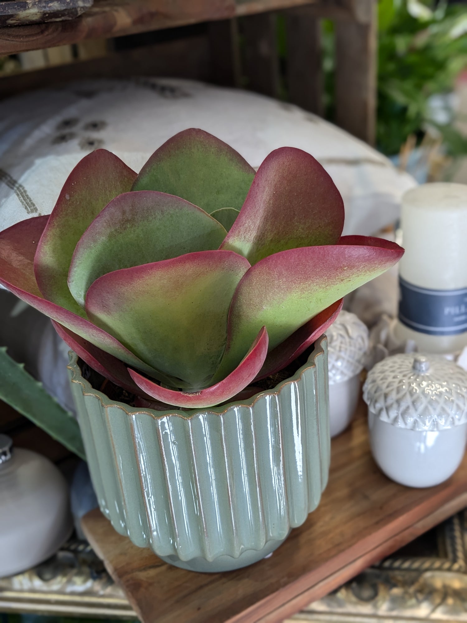Plant maintenance: A Paddle Plant thrives in bright light to full sun year round. Give the plant a quarter turn every week or so to expose all sides to sunlight. Water thoroughly, then allow top 2 inches of soil to dry out between watering.