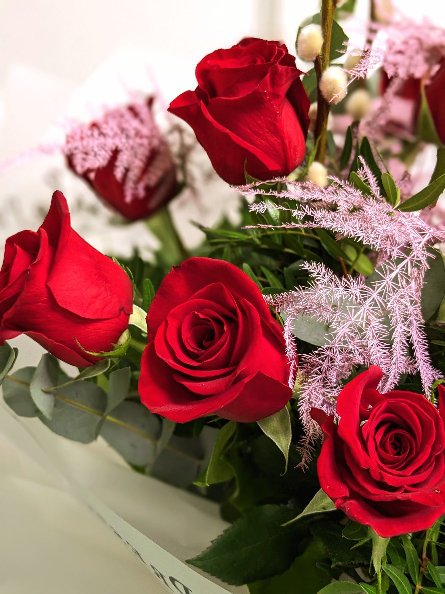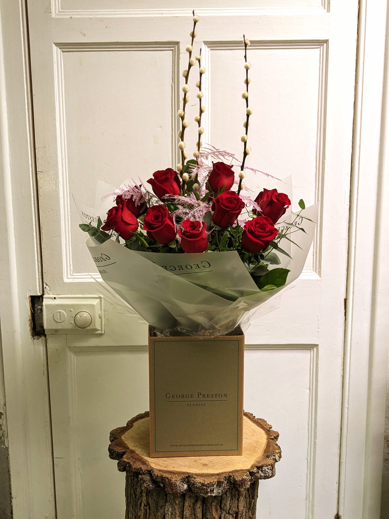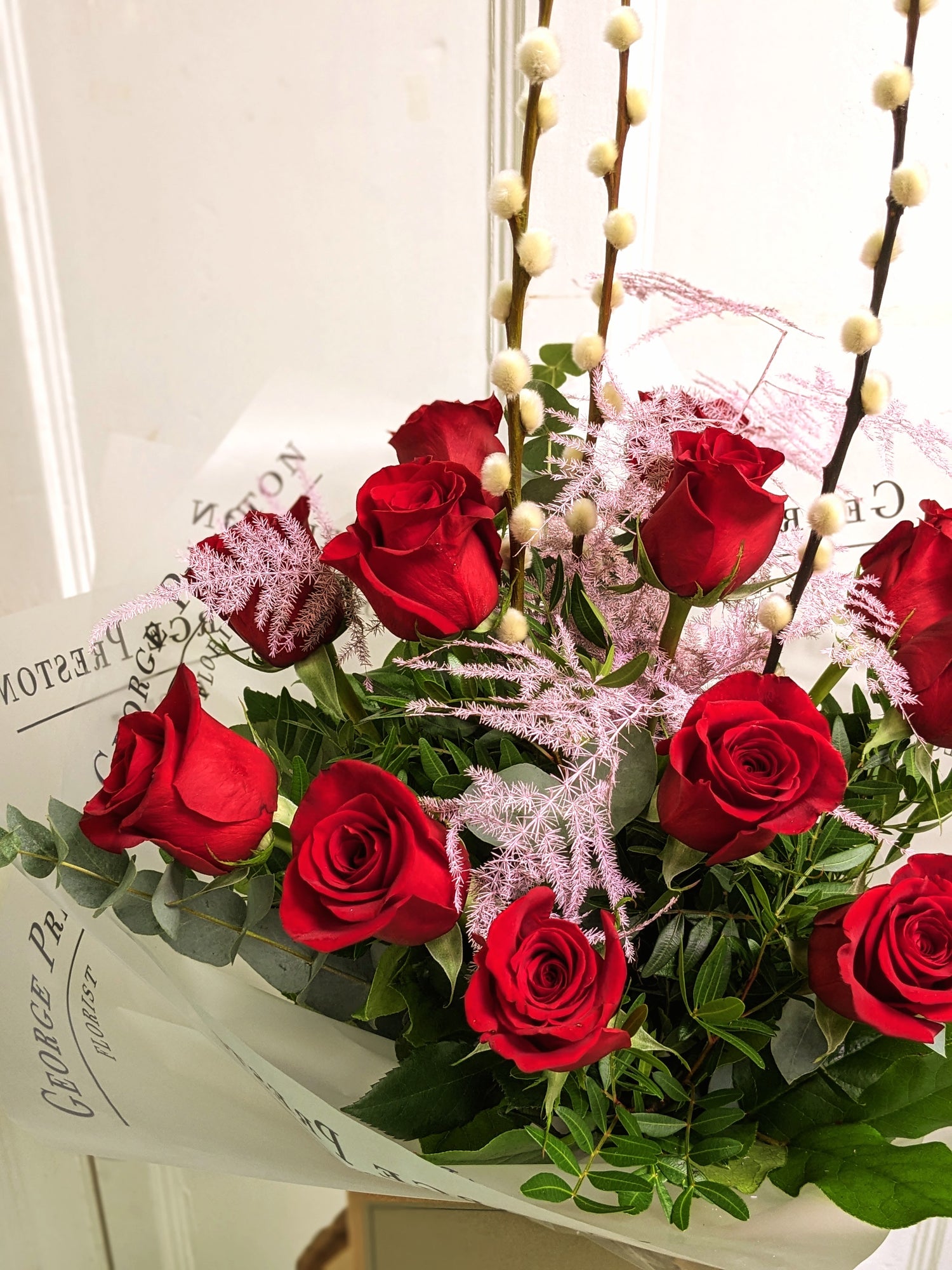 A classic dozen large headed roses, with mixed seasonal Irish grown foliage for gentle contrast. Lovingly hand-tied, nothing says I love you like it!