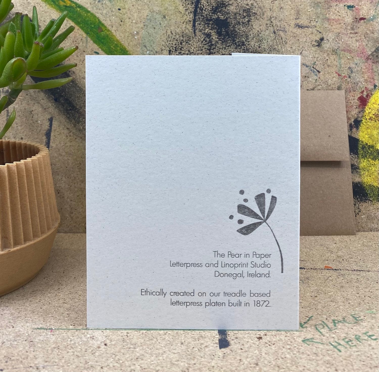 This letterpress eco-friendly greeting card began as an illustration - then became a hand carved linocut - then a linoprint and finally went through Florrie a number of times!